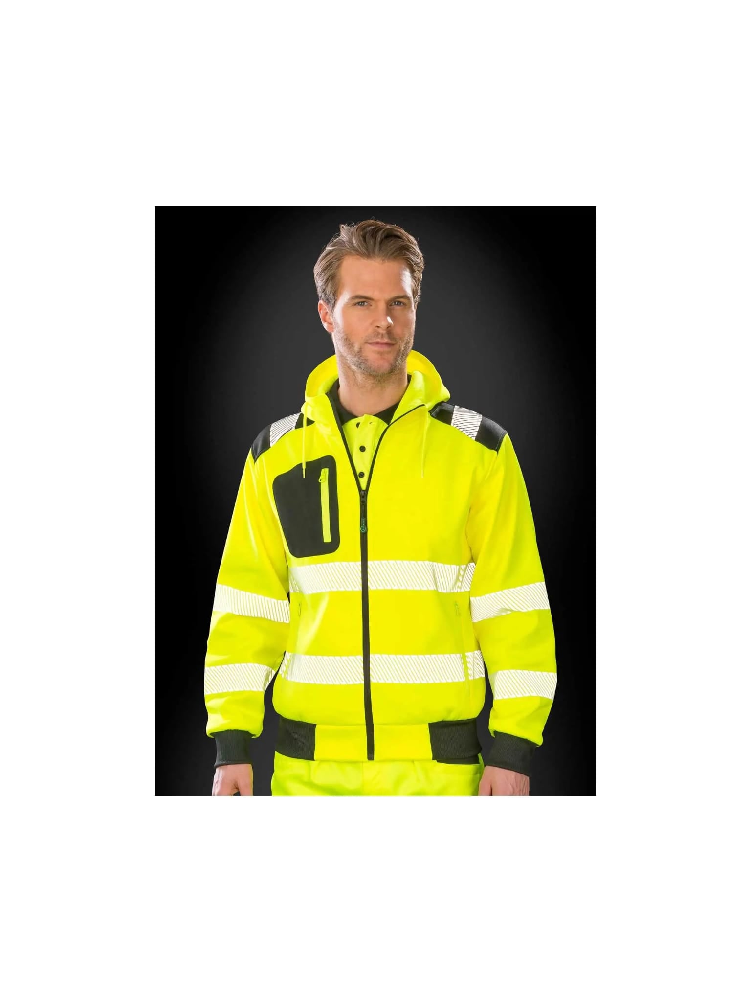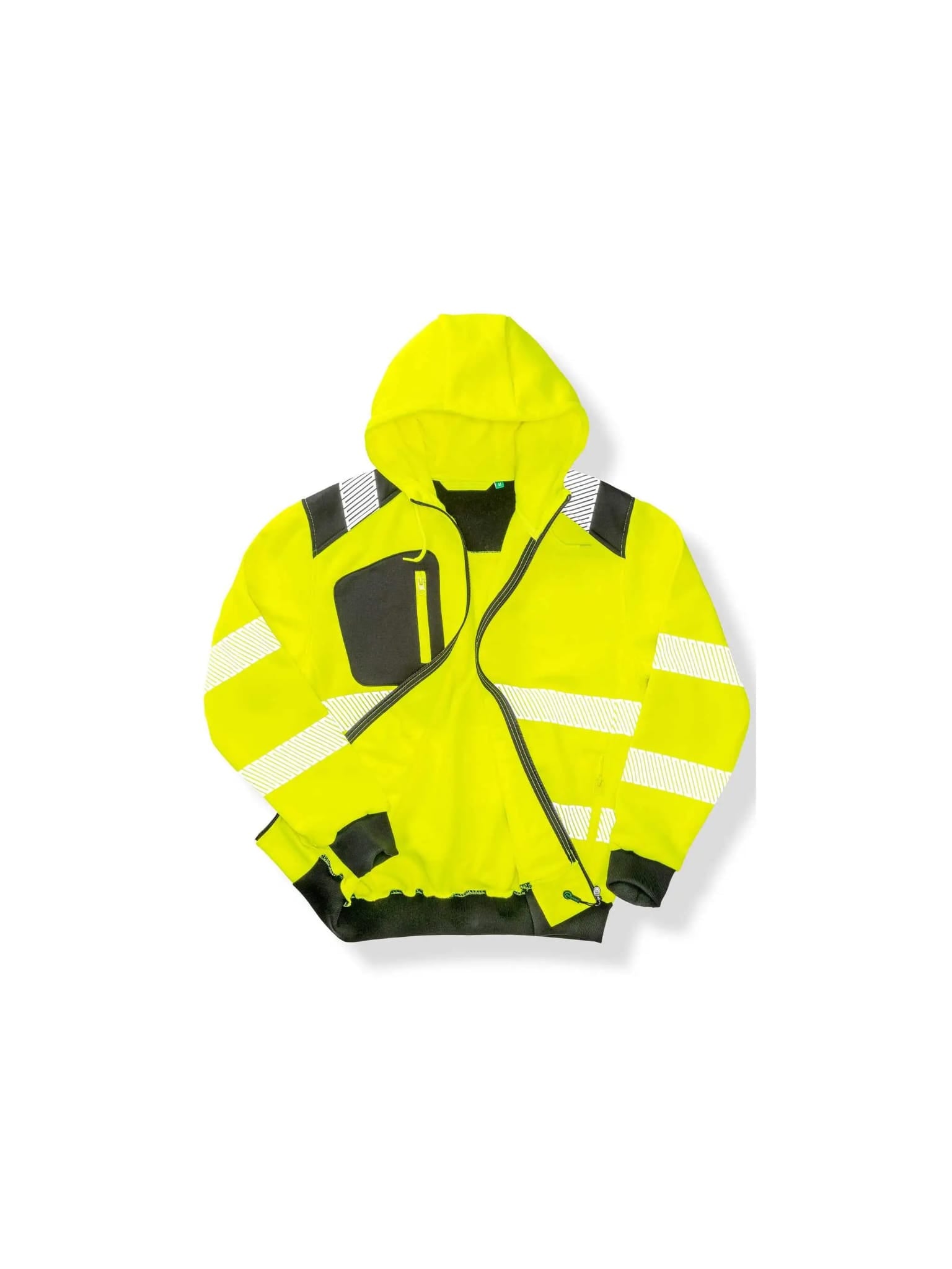 100% poliestere riciclato REPREVE. Costine: 100% pol. Felpa con cappuccio, traspirante ed elasticizzata, orlo inferiore e polsini elastici a costine, strisce di sicurezza stampate, zip frontale YKK, tasche frontali e sul petto con zip, felpata internamente, cappuccio con cordini. EN ISO 20471: 2013+A1:2016 Class 2