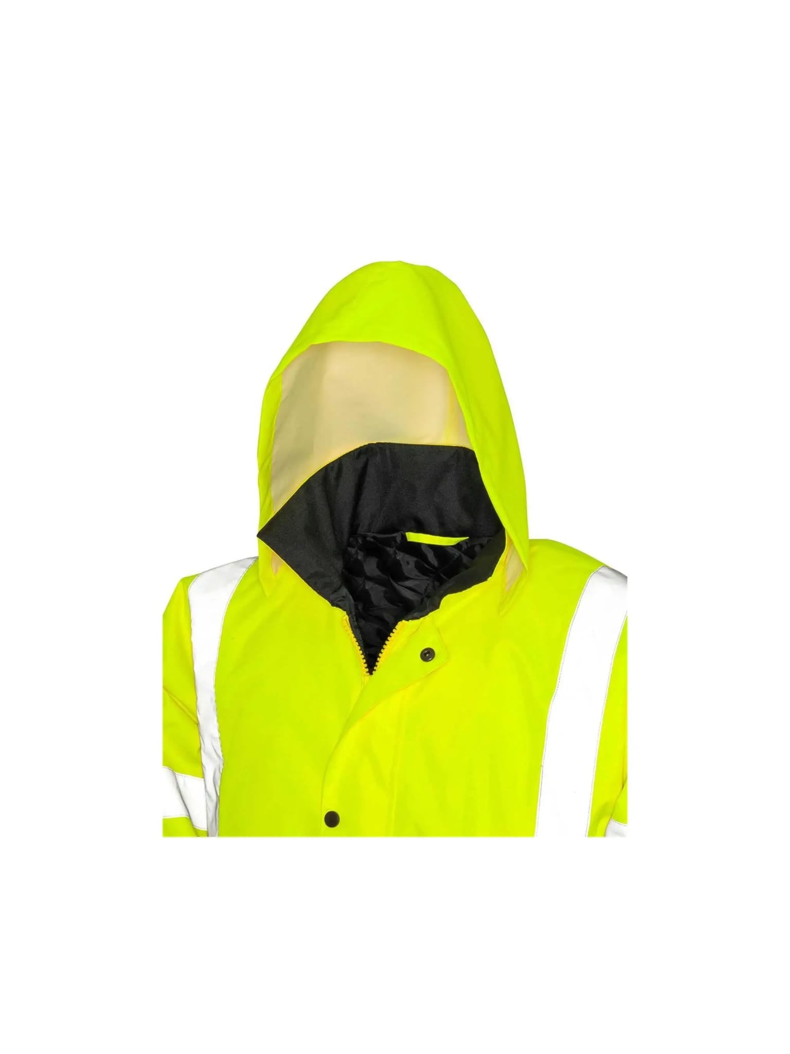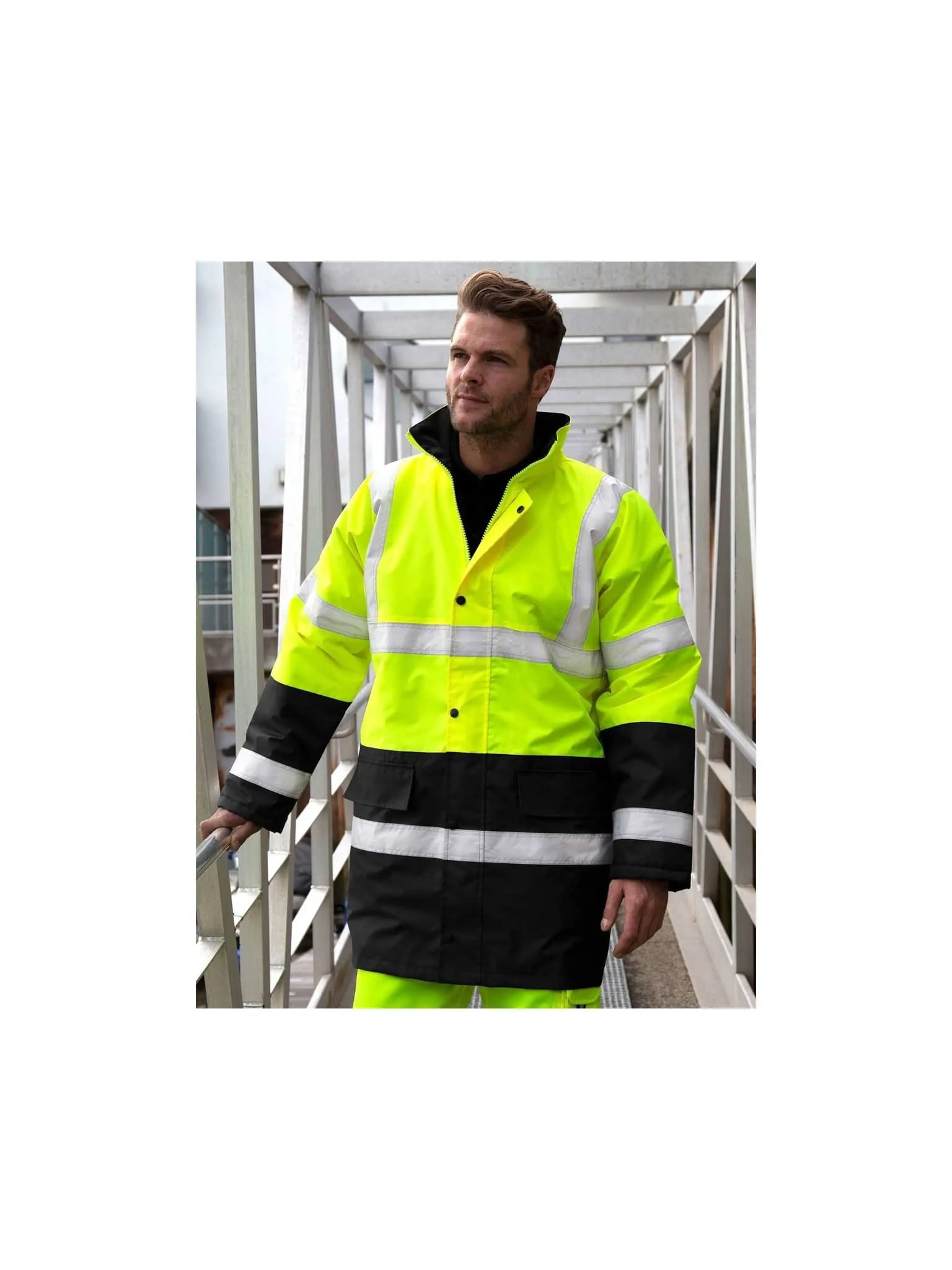 100% poliestere. Giacca da lavoro impermeabile (1000 mm), antivento, conforme alla norma EN ISO 20471: 2013 + A1-2016 - Classe 3 e RIS-3279-TOM - Classe 3 (solo arancione). Spalle riflettenti da 50 mm e fasce catarifrangenti su corpo e maniche. Ampie tasche coperte da patta antivento, cappuccio a scomparsa con cordino regolabile e patta antivento con bottone automatico. Fodera trapuntata a rombi, cerniera robusta a doppio cursore, cuciture completamente nastrate, colletto rialzato e tasca interna. Parte inferiore scura per nascondere lo sporco. Adatta alla personalizzazione, senza etichetta.